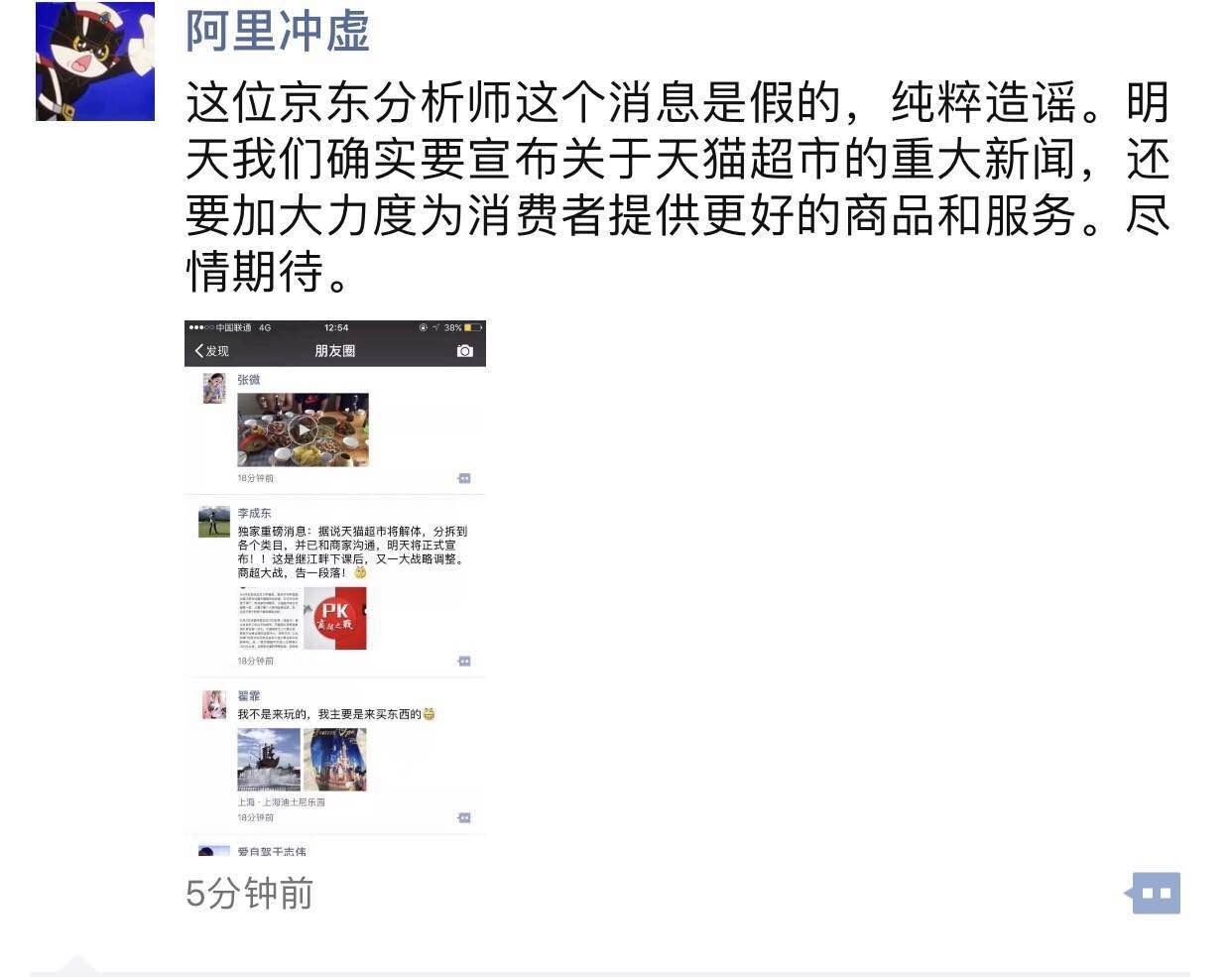 随后,阿里巴巴集团CEO助理颜乔(冲虚)发布朋友圈回应:这个消息是假的,纯粹造谣。明天确实要宣布关于天猫超市的重大新闻,还要加大力度为消费者提供更好的商品和服务。此外,有消息人士称,“猫超的组织都还在,就是多了一些领导。”