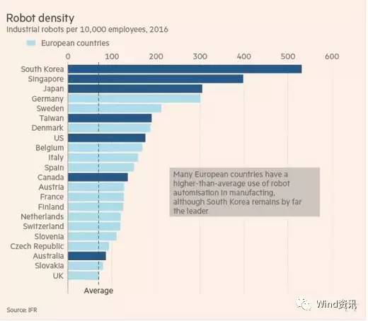 英国金融时报2016年统计数据显示,韩国是世界上工业机器人使用密度最高的国家。