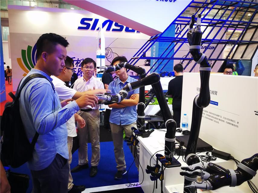 现场观众正在参观轻量型仿生机械臂