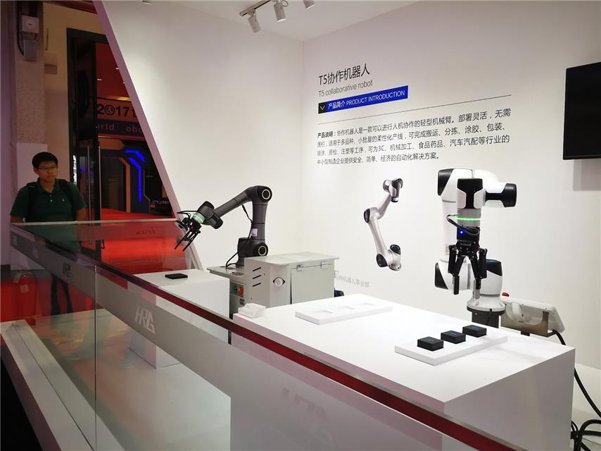 同样是机械臂机器人,展馆另一侧的T5协作机器人略显小巧。“这是一款可以与人协作的轻型机械臂。”哈工大机器人集团特种机器人事业部技术总监王倩解释说,和传统机械臂相比,T5机器人凭借其操作简单、安全性高、部署灵活等优势,十分适用于多品种、小批量的柔性化生产线。同时,也降低了机器人的使用门槛,扩大了市场范围。“这款产品目前正处于研发向测试转换的过渡阶段,后续还将会做一些完善高级功能、验证可靠性等工作,预计明年会投入生产。”王倩说。