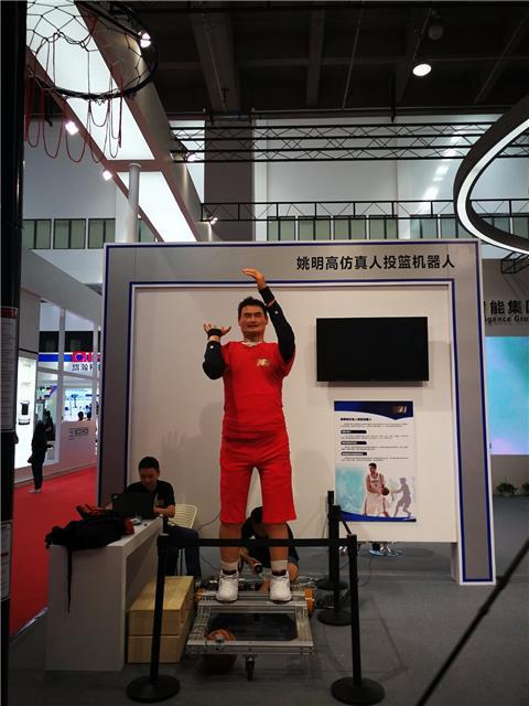 右手托球、左臂斜上方45度扬起,双眼紧盯篮筐,瞄准、出手!篮球在空中划出一道美丽的弧线……“进了,进了,好棒啊!”现场喝彩不断,掌声不停。这个身着一套红色运动衣的“大块头”——姚明高仿真投篮机器人,首次在2017年世界机器人博览会上参展便大放异彩,引来无数游客驻足拍照。
