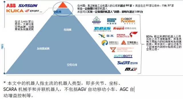 经过仔细的研究,我们发现除了排名前14家的机器人制造商之外,只有13家公司具备一定的生产和销售能力。而另外95% 以上所谓的机器人公司实际上并不是制造商,而是具有不同能力的经销商和系统集成商,其中很大一部分还是为了获得地方政府补贴而成立的空壳公司。