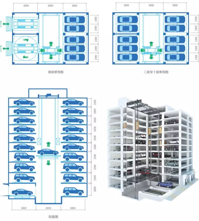 车库占地少、容量大。在系统每层都至少有一个横移车负责本次车辆存取,由升降机将不同的停车层与出入口相连。可满足地上或地下从2到12层车库的使用要求。