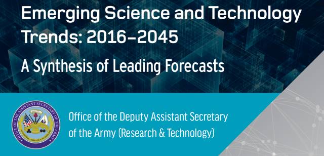 2016年年中美国陆军公布的一份长达35页的《2016-2045年新兴科技趋势报告》。该报告是在美国过去五年内由政府机构、咨询机构、智囊团、科研机构等发表的32份科技趋势相关研究调查报告的基础上提炼形成的。