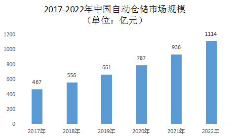 按照当前发展势头,未来五年,我国自动化仓储市场规模增速将保持在18%-20%左右的增速水平,到2022年市场规模将超过1100亿元,达到1114亿元,前景十分广阔。