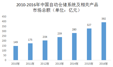 2010年,我国在自动仓储系统级及相关产品方面的市场总额接近150亿元。近几年,自动仓储应用领域不断拓展,行业应用规模也在不断提升,截止到2016年底,我国自动仓储系统及相关产品市场总额已经超过了390亿元,达到392亿元,同比增长了20%左右。