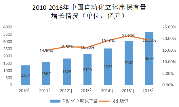 2006年底,全国自动化立体库的保有量已超过500座。据不完全统计,2012年建设的具有较大规模的立体仓库在建项目有130多座,2012年全年共保有自动化立体库1800余座。截止到2016年,我国自动化立体库保有量已经达到了3650座,比同比长了19.3%。