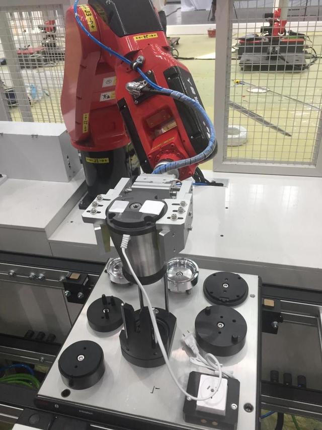 该公司营销总监李琦介绍,这条生产线是华数与小熊电器共同研发的,全条生产线长近36米,展会现场专门截取了大概12米长向观众展示。这些环节之前需要人工较多,17个机器人可节省17个工人,而且大大提高了生产效率和产品质量。“从原料上线到成品下线原来需要20秒,现在大概只需要12秒。最主要的是产品质量更稳定,从第一件到第一万件产品,质量不会有变化。”据悉,这条生产线11月份将正式在小熊电器应用,实现小熊产品的装配、检测、物流全自动化。”