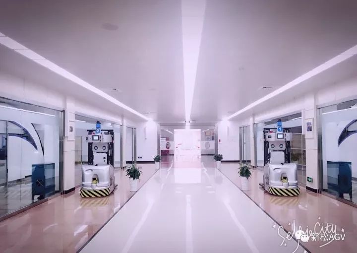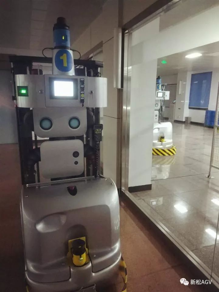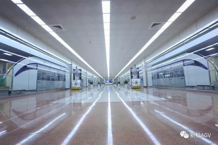 从两侧的玻璃中,可以看到AGV的倒影,当然反光板的倒影在其中,且由于光线的折射,导航信号会受一定影响,这些都已被克服,使得AGV可以在这样华丽的场所里运行。