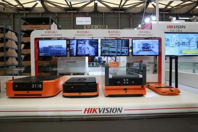 在前台后方的静态展示区,展示了海康威视移动机器人“橙色军团”——海康威视仓储机器人,海康威视搬运机器人-履带式,海康威视智能泊车机器人。