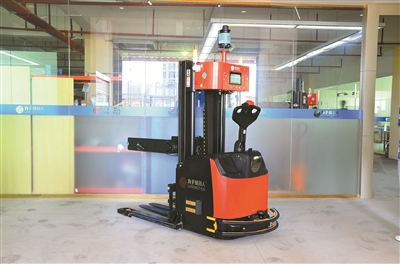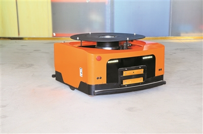 ▲装配有混合激光导航技术、AGV控制与调度系统三大核心技术的仓储搬运机器人。