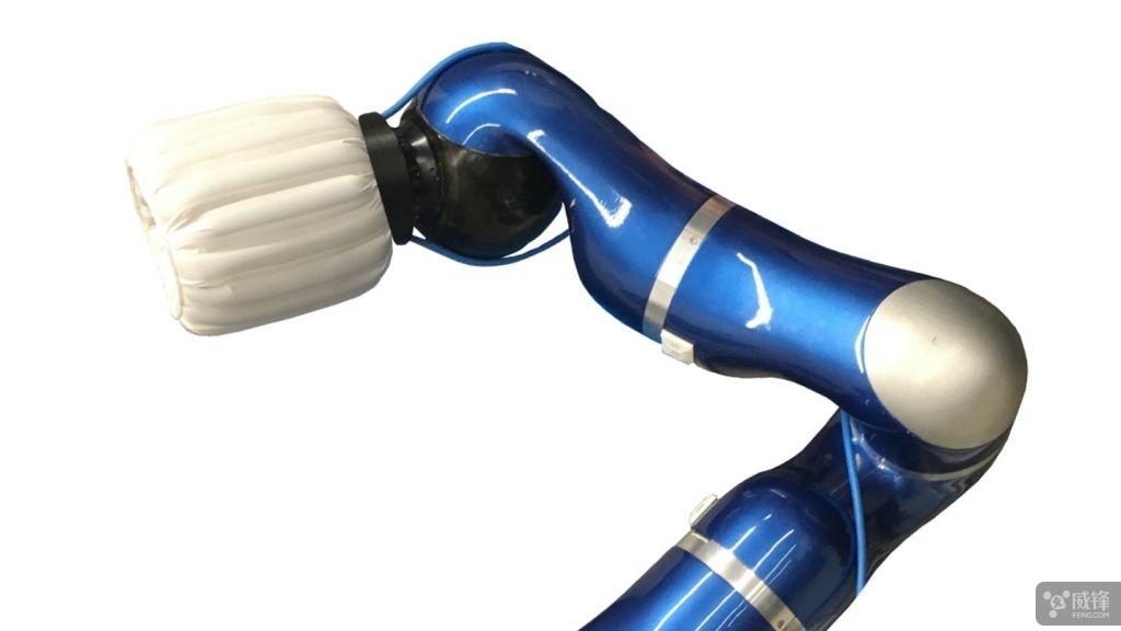 这个想法早在去年已经被提出,直到上周研究人员才公布了进展视频。正如视频所示,安全气囊围绕在机器人锋利的边缘上,在与人类接触时,就会伸展开,避免划伤人类。