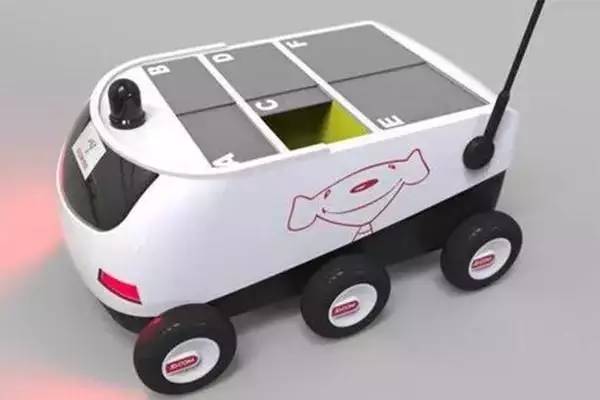 这款无人车车身尺寸为:1x0.8x0.6m,有6个不同尺寸的存货仓,可按照规划好的路线自动导航行驶,并可实现智能避障、跟随功能。