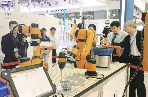在第十九届工博会上,中国工程院院士倪光南(右一)在遨博智能科技有限公司展台观看其展出的具有自主知识产权的最新工业协作机器人。经济日报记者 许红洲摄
