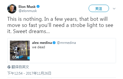 马斯克表示:“这没什么,几年后,这个机器人会移动得太快,你需要一盏频闪灯才能看到它。。。”