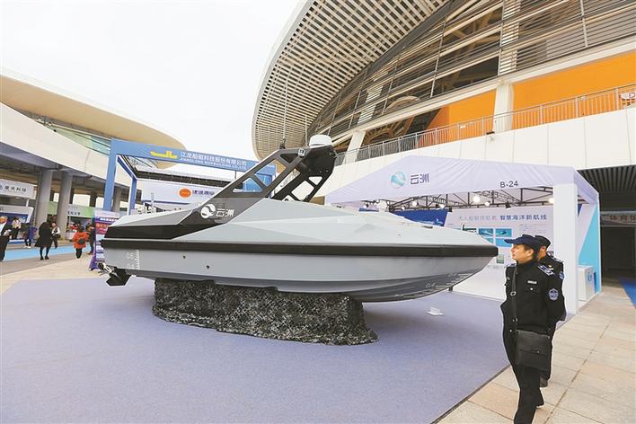 在2017年中国海洋经济博览会新增设的军民融合展区内,有一艘由云洲智能公司研发的最新一代L30警戒巡逻无人艇,以其优异的产品性能,可在安防、军用等领域广泛运用等特点,备受瞩目。