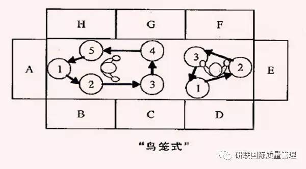 鸟笼型布局往往没有考虑到物流、人流顺畅的结果,这种布局错误的用机器设备或者工作台把作业员围在中间,使得物流不顺畅,在制品增加,单元与单元之间的相互支援也变得几乎不可能。