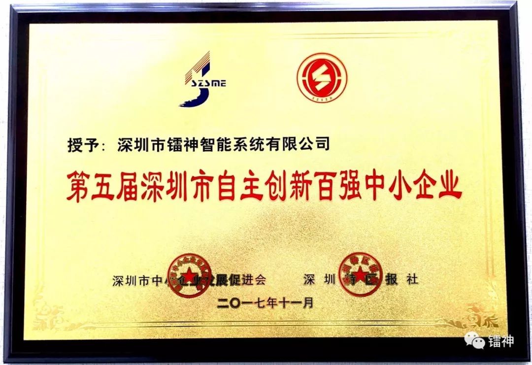 [2017年11月22日] 深圳第五届自主创新百强中小企业暨十佳中小企业创业英才,在五洲宾馆“新鲜出炉”。经过严格程序评选,镭神智能从数千家报名企业中脱颖而出荣获“第五届深圳自主创新百强中小企业”的光荣称号,成为深圳160多万家中小企业的优秀代表。