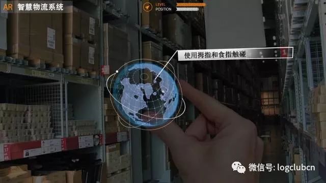 第一步,带上AR眼镜,用拇指和食指触碰一下面前的地球标志,进入拣选作业流程。