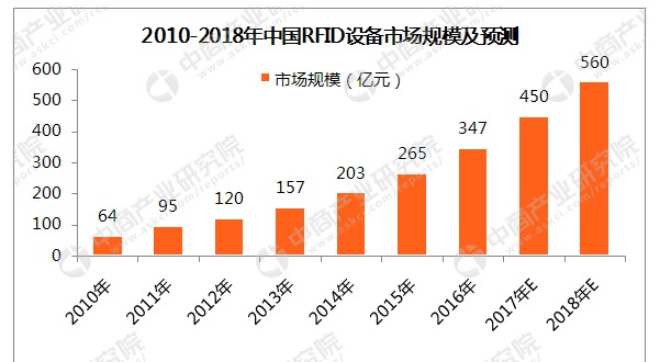据中商产业研究院发布的《2017-2022年中国物联网行业市场前景及投资机会研究报告》数据显示,2010-2016年RFID设备的年均复合增长率为32.5%,2017年中国RFID设备的市场规模有望突破400亿元,达到450亿元。随着RFID技术被广泛使用以及高端设备的巨大需求,预计2018年中国RFID设备市场规模将进一步扩大,市场规模将达到560亿元。