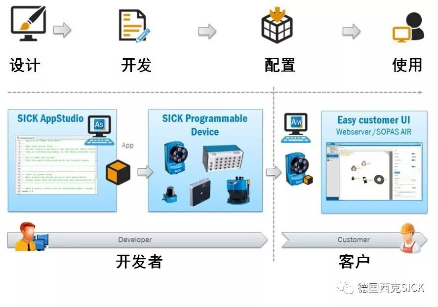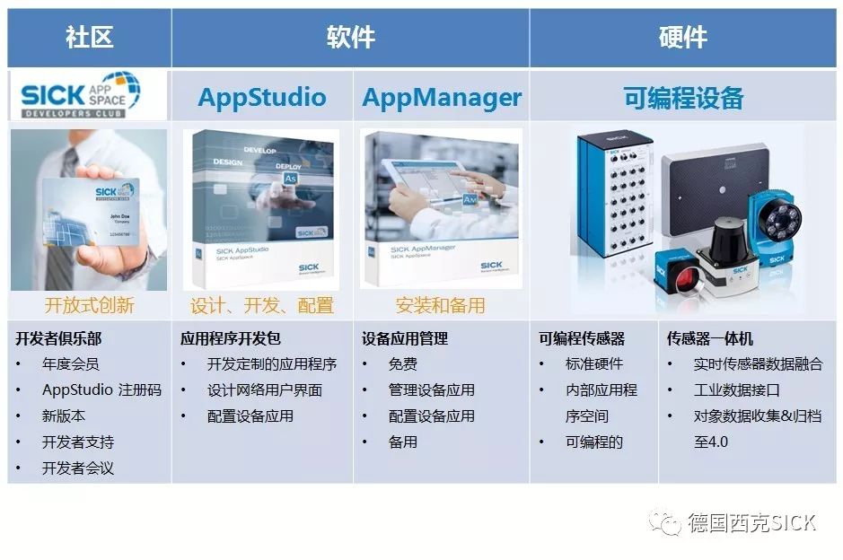 SICK AppSpace将带领一大波新产品来袭,包含一系列硬件即SICK可编程设备;一款为这些可编程设备提供软件平台,用于开发应用程序的软件AppStudio,简称As;一款用于管理应用程序的免费软件AppManager,简称Am。