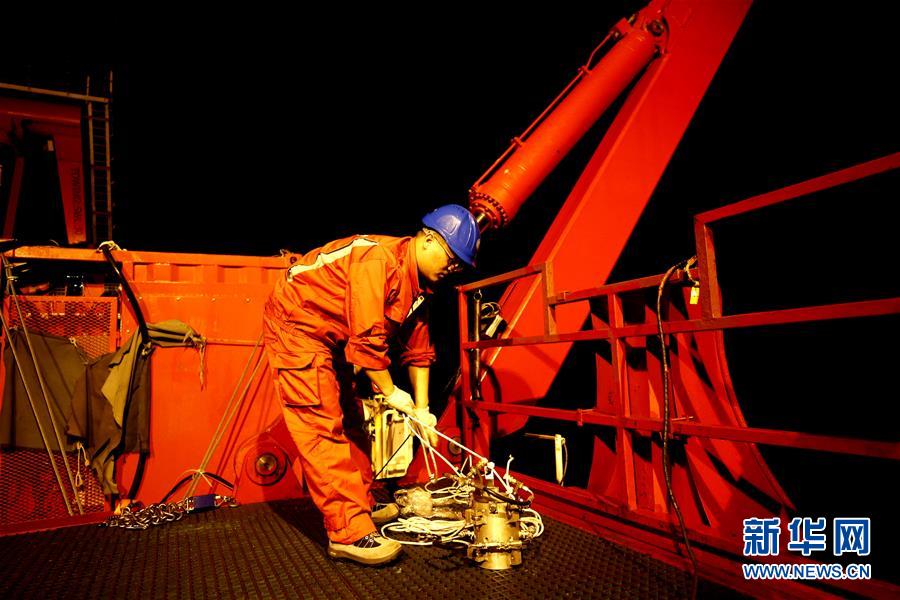 3月16日,“发现”号ROV准备进行测试。当日,“科学”号正奔赴西太平洋执行麦哲伦海山科学考察航次任务。为确保“发现”号ROV深海机器人(水下缆控潜器)达到最佳工作状态,技术人员在它正式下海作业前,对它进行了海下1000米的测试。新华社记者 张建松 摄