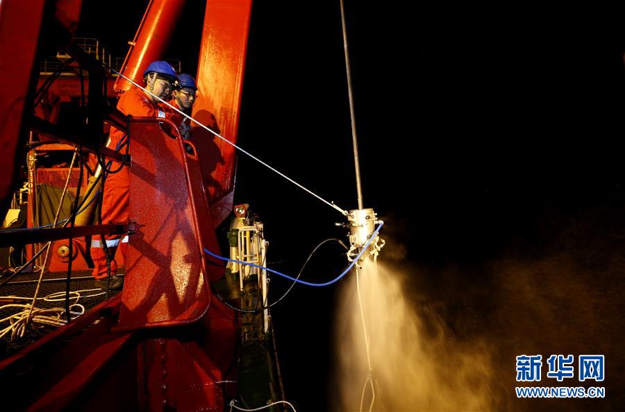 3月16日,“科学”号技术支撑人员测试自主研发的“发现”号ROV洗缆装置。当日,“科学”号正奔赴西太平洋执行麦哲伦海山科学考察航次任务。为确保“发现”号ROV深海机器人(水下缆控潜器)达到最佳工作状态,技术人员在它正式下海作业前,对它进行了海下1000米的测试。新华社记者 张建松 摄