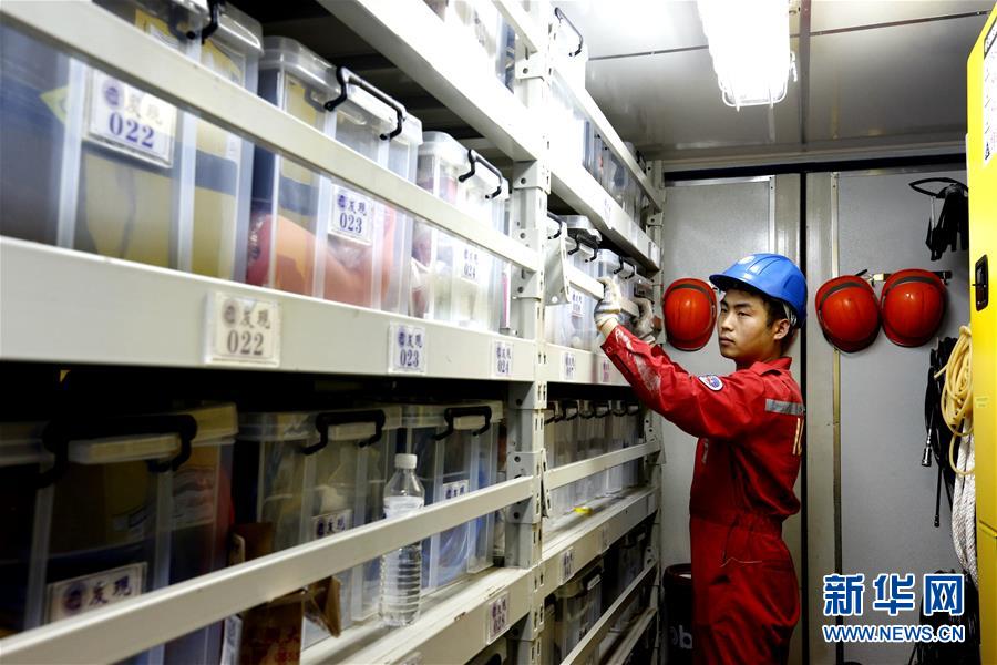 3月16日,“科学”号技术支撑人员高志远在工具间查找“发现”号ROV的备件。当日,“科学”号正奔赴西太平洋执行麦哲伦海山科学考察航次任务。为确保“发现”号ROV深海机器人(水下缆控潜器)达到最佳工作状态,技术人员在它正式下海作业前,对它进行了海下1000米的测试。新华社记者 张建松 摄