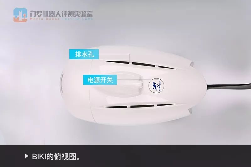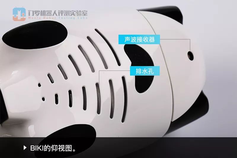 在BIKI的正面,我们可以看到一个既像驾驶仓又像机器人独眼的透明罩,里面密封着1600万像素的摄像头。其上方是显示工作状态的指示灯,下方是探测水下障碍的红外传感器,两侧各有一盏114流明的水下照明灯。而机身上方的背鳍内藏Wi-Fi与GPS收发天线,机身底部则有一个红色的声波接收器,用于接收水下遥控器的声波信号。BIKI的电源开关位于机身顶部,即背鳍(天线)的后方。同时,门罗评测工程师观察到,BIKI的外壳采用了开放式设计,仅对内部进行了局部密封,所以外壳上具有众多排水孔,用以快速排出内部水分。