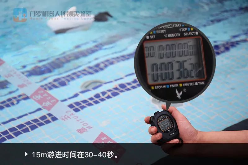在直线运动测试中,我们以警戒带和池底边线作为参照物,让BIKI以最快速度向前游进了15m,并反复进行了多次。从结果看,15m直线游动的测试计时均在30-40秒,基本符合它最大游动速度0.5m/s这一官方数据。