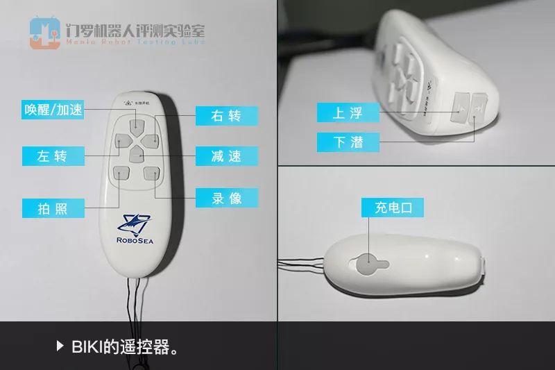 手机APP只适用于BIKI在水面上游动(背鳍需露出水面)时进行操控,当它潜入水中时就需要使用专用的遥控器进行操控了。门罗评测工程师发现,由于该遥控器采用了声波传导的方式对BIKI进行控制,所以遥控器与BIKI需要位于同一介质中,如都在水中或空气中,当然实际应用都是针对前者。
