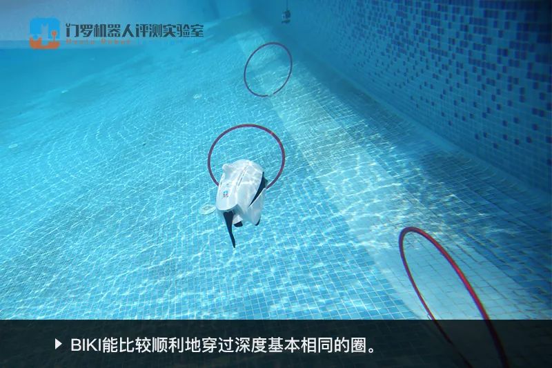在避障测试中BIKI表现不错,当它检测到泳池壁等障碍物时,会自动减速。接下来,会出现两种结果,一是改变行进方向,并慢速地躲避障碍物;二是减速至停止,并随惯性慢慢飘向障碍物。