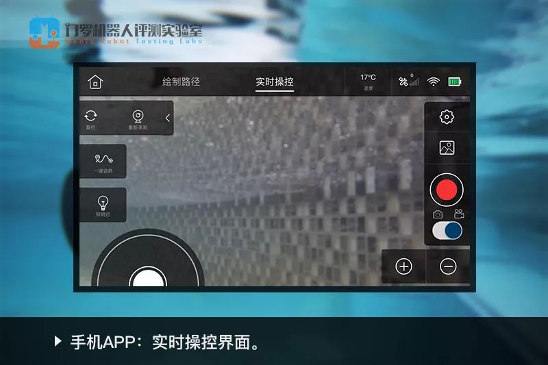 在实时操控界面的左侧,由上至下分布着“记忆路径”、“一键返航”、“照明灯”等按键以及“虚拟摇杆”。右侧分布着“设置”、“相册”、“拍摄”、“拍照/录像”和“加减速”等按键。而在主界面顶部,则是“HOME”、“绘制路径”、“实时操控”等界面的切换按钮,以及水温、GPS信号强度、Wi-Fi信号强度、电量等数据。