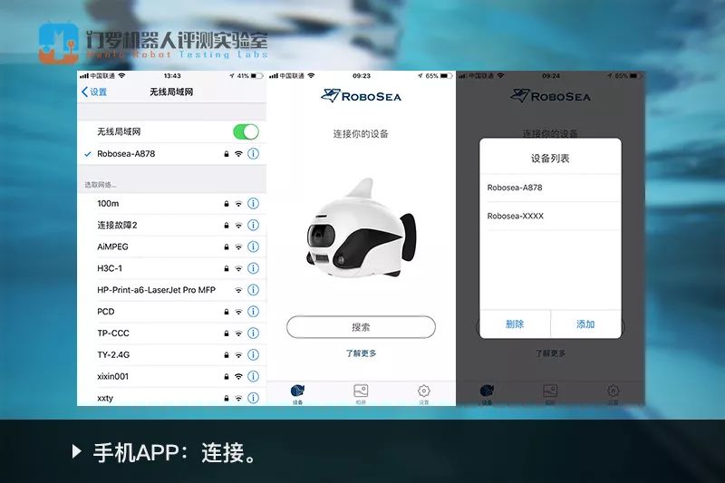想使用手机操控BIKI,首先需要下载安装名为“RoboSea”的APP(苹果App Store与各大Android市场均可下载)。然后长按BIKI的电源开关约2-3秒,蓝色指示灯亮起后就可以把它放入水中。之后,开启手机Wi-Fi,并在列表中找到名为“Robosea-XXXX”的热点并接连。连接成功后,打开APP点击主界面上的“搜索”按钮,就会找到与热点对应的BIKI,选择它以完成连接。最后点击主界面上的BIKI图案,就跳转至实时操控的界面了。