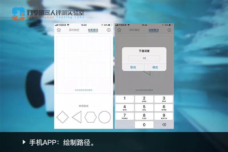 在APP上,除了可以对BIKI进行实时操控外,还可以为它预设线路,让它自行游走。点击“绘制路径”按钮,待界面跳转后即可绘制游动线路或者选择预设线路,并指定游动深度等。点击“确定”后,BIKI就会按照你预设的线路进行游动。这一功能适用于泳池或水族馆的展示,让它自己玩。