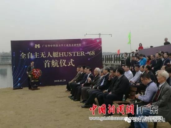 广东华中科技大学工业技术研究院全自主无人艇首航仪式20日在东莞松山湖举行,图为首航仪式现场