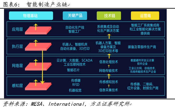 智能制造产业体系已逐渐成形,上游行业主要为制造行业的零部件以及感知层次的相关产品,中游行业则是主要体现为网络层的相关信息技术、管理软件和平台软件等,而下游领域主要为执行层和应用层,以工业机器人(300024)、智能机床、3D打印为产品构成的自动化生产线和智慧工厂。