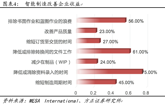 制造业企业的制造周期时间是指从订单发放经车间周转到最后发货的总时间。制造周期时间越短,制造商库存越少,市场需求变化时报废的材料越少,调整适应变化的灵活性越大。反之制造周期时间越长,积压的多,不良及废品增多,储存费用等等都会增加,此外,制造周期越长,工厂车间可能出现的问题越多。减少制造周期时间不仅影响材料预备,还可以改善出货计划,加快产品输出,因为材料在到下一个操作之前停留的时间更短,故过程中的在制品减少。因为产品处理更少,故产品质量得可以到改善。制造周期时间是在多数电子和电器等复杂品类装配中的最大的问题,制造周期每缩短一倍,企业年利润收益预期可增长2.2倍。根据美国MESA International调查数据显示,智能制造可显著缩短制造周期时间、提升生产效率,降低成本,提高单位时间产出,从而提升企业收益。因此,出于企业自身对盈利的追求,它们亦将会加大对智能制造领域的投入。