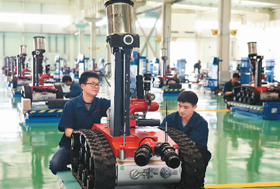 位于江西共青城的中信重工开诚智能装备有限公司是中国较早研制特种机器人的企业之一。目前,企业已形成5大平台特种机器人产品,开发出了消防灭火侦察机器人、危险场站巡检机器人、水下机器人等20多种产品,广泛应用于消防、市政、矿山、石化等多种危险环境,产品取得多项专利。图为3月30日,员工在生产基地组装防爆消防灭火侦察机器人。