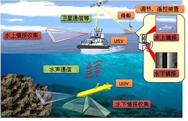 反潜战 无人潜航器在反潜战中可作为潜艇的外部水声传感器平台,执行情报、监视与侦察任务;并可将敌军潜艇引诱至火力攻击范围内增强打击能力;还可作为潜艇远距离的通信中继站。
