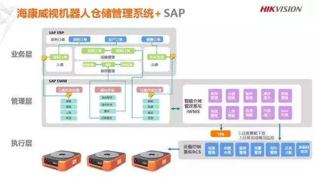 基于“货到人”模式的海康威视智能仓储管理系统,通过其管理层与业务层无缝对接,与SAP EWM、ERP系统深度融合,优化仓储管理,支持多种仓储业务场景需求,实现数百台机器人协同作业,大大提升业务处理效率,有效降低人力成本。