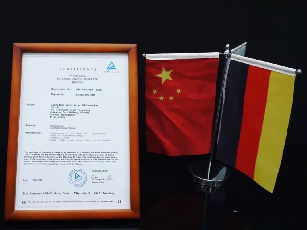 德国当地时间2018年4月23日下午,德国莱茵TÜV(以下简称“TÜV莱茵”)为广东嘉腾机器人自动化有限公司(以下简称“嘉腾”)自主研发生产的潜伏牵引型AGV(无人搬运车)产品,颁发了大中华区首张符合欧洲机械指令MD2006/42/EC的CE认证证书。嘉腾也由此成为国内首家获得TÜV莱茵CE认证的AGV生产企业,标志着其产品满足了欧盟相关法规及技术要求,获得了进入欧盟市场的通行证,这将助推嘉腾迈向更广阔的全球舞台。