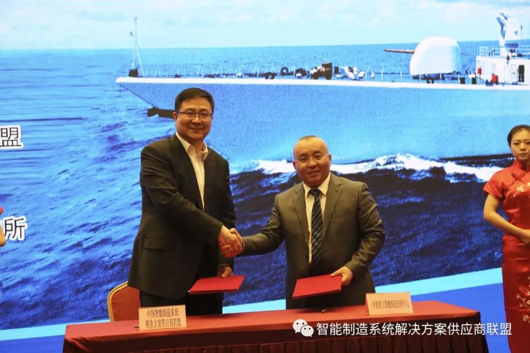 联盟赵波秘书长和创新中心顾浩所长就中国智能制造系统解决方案供应商联盟船舶行业分盟筹建进行合作签约。