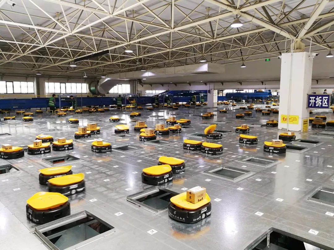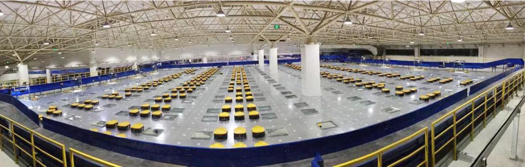 在一片足球场般宽阔的地面,一群装有托盘的椭圆形黄色机器人快速而有序地穿梭着,将一件件包裹送达指定格口,按照不同目的地完成分拣。