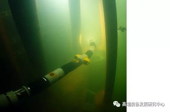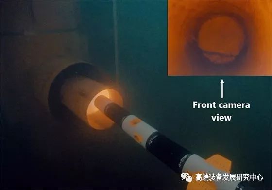 右上角的图像显示前置摄像头模块的视图。进入和检查这种狭窄结构的能力要求潜水器具有非常窄的横截面。这个画面因此说明了潜水器的独特能力。