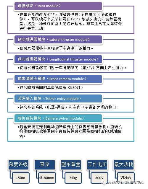 设计者通过模块化概念来提高该潜水器的灵活性, 并根据不同的操作要求简化其配置。共开发了六种类型的模块, 所有模块具有相同的机械和电气接口, 使模块可以互换。上图展示了六种类型的模块, 以及通过这些模块的不同组合实现的两种不同的潜水器。
