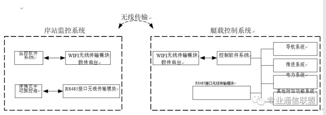 (2)艇载信息综合监控系统与自主航行控制系统,通信内容包括运动轨迹、控制命令、无人艇实时运动状态。