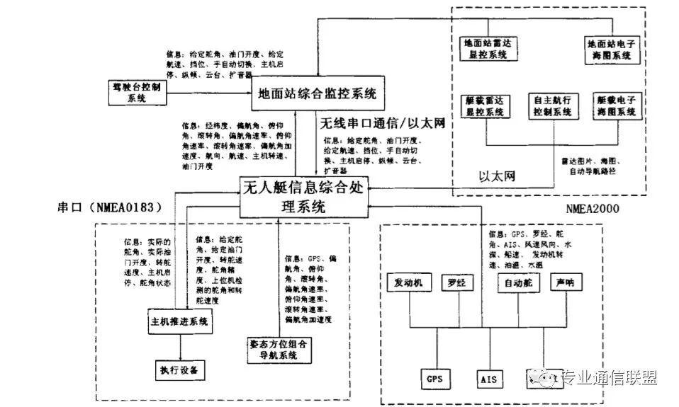 (3)无人艇信息综合处理系统与地面站综合监控系统,串口通信不是主要通信,主要用于一些不具备以太网通信接口的设备,最后这些数据转换为以太网通信接入到主通信系统中。
