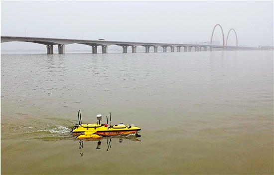 5月27日,由中铁四局承建的杭州轨道交通6号线6标过江隧道盾构机,在钱塘江底经过1530米的顺利掘进后,成功抵达钱塘江江滩。为保障施工安全与工程质量,中铁四局在国内首次引入无人测量船,解决了过江盾构施工中江底地形探测不准和沉降观测难度大等难题。图为无人测量船正在钱塘江上进行江底地形探测。