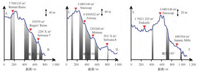 图7清晰显示了该区域的复杂地形特征,受火山作用及海底熔岩分布的影响,海底表面崎岖多变,地形复杂。研究区中央地形相对平缓,坡度小于15°,西北侧坡度大于40°(图8)。测量结果显示,研究区南部和北部地势较高,中部偏北区域发育一个垂直于洋脊走向的低地,中部发育了一个新生的火山区,面积约500m×1500m。该新生火山区域是一个椭圆形区域,主要由3个丘状地貌构成,火山区南部发育两个小型火山口,最南侧火山口的环形坑直径约50m,最大深度约20m,中部火山口的环形坑直径约70m,深约5m。前人观测表明该区域热液溢出口和烟囱主要分布于中部的Snowcap、Fenway、Satnic区域和北部的Roman Ruins、Roger′s Ruins区域(图7)。这些热液喷口主要分布在火山区的两侧的斜坡处,其中有两处热液喷口能够在高分辨地形图上辨识出来。在火山区的东侧边缘,发育一个突出的圆锥形地貌,与周边地形高差可达40m,锥体中央下陷,对应于活动的Snowcap热液区。另外,在北部低地也发育一个长形的小型丘体,与周边地形高差约20m,对应于之前发现的Roman Ruins热液区。